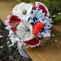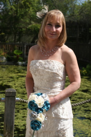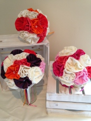I Loved making the flowers for Sarah's Wedding in September. She didn't have a particular colour scheme and had decided to let her two bridesmaids wear their favourite colours, one was orange and the other pink! She also mentioned that the groom was wearing a plum purple tie. We decided to try and link all these colours together in her bridal bouquet but she wanted the two bridesmaids to have their flowers to match in with their dresses. I was a little worried as to how i was going to get these colours to match! but i love a challenge and so after a long time spent in the fabric shop experimenting with matching various colous together, i managed to find this selection. We linked ivory in to make them a bit more bridal and to make sure they werent to bold against sarah's ivory wedding dress, and also found a lovely coral colour which happened to look pink with the pinks and orange with orange, This was great as it brought the two bridesmaids bouquets together and linked them in with sarahs aswell. I can't wait to see the wedding photo's and hopefuly share them with you soon!!